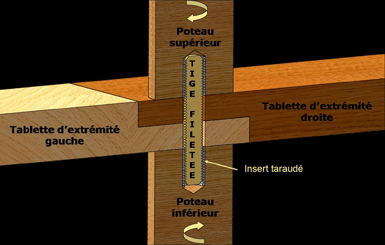 Nos meubles modulables sont tous composés de tablettes et poteaux assemblés en toute simplicité, sans aucun outil, par le serrage manuel des tablettes entre les poteaux.