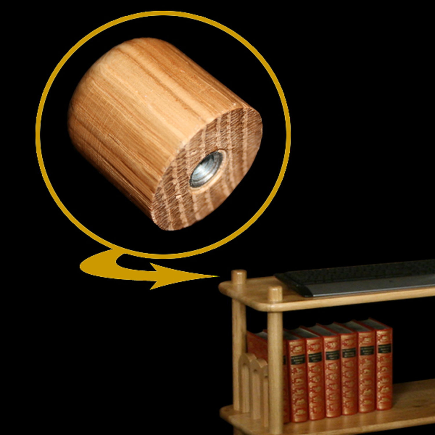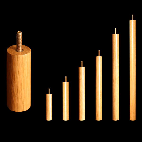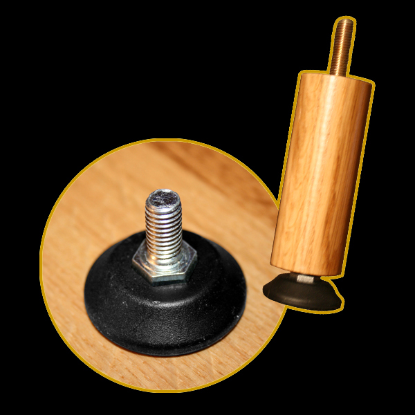 Les meubles sont terminés au sol par des « pieds réglables » qui permettent de caler et d’ajuster les niveaux. Les hauts de meubles sont finis, soit par des cabochons en chêne, soit par des vis en laiton, les deux pouvant être panachés dans un même meuble.