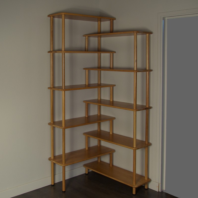 Bibliothèque en chêne massif 2 en 1 dont l'angle modulable permet de passer d'une bibliothèque d'angle à une bibliothèque droite en un clin d'oeil, sans aucun démontage! Son design décalé et épuré s'adapte à votre intérieur en y apportant une ambiance chaleureuse. Cette bibliothèque peut être personnalisée en modifiant à votre guise l'espacement entre les tablettes ou encore la largeur de celle-ci.