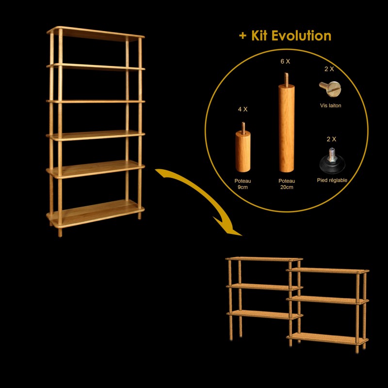 Grâce à notre Kit Evolution, votre étagère pourra se transformer en une étagère basse et s’adapter ainsi à un nouvel environnement ou une nouvelle utilisation. Ce kit est vendu seul (ref. K1ED01) ou en option avec l’étagère BASIQUE. Vous pouvez également laisser libre cours à votre imagination pour faire évoluer votre étagère. Pourquoi pas y ajouter un coin bureaux ou encore la transformer en étagère d’angle? Tout est possible grâce à notre concept de meubles évolutifs!